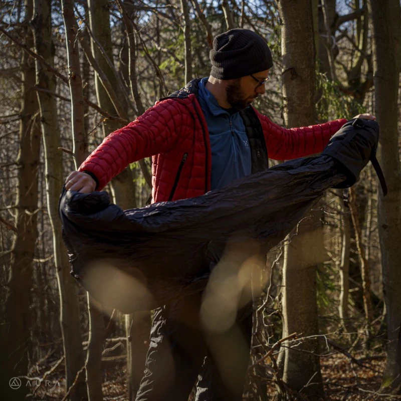 Sac de couchage ultraléger +7°C avec ouverture centrale, garni de 200 g de duvet d’oie polonais de 860 cuin.