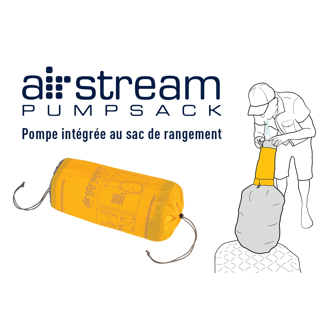 Valve à clapet anti-retour facilite le gonflage et le dégonflage. Le matelas est livré avec le sac de rangement et de gonflage Airstream Pumpsack.