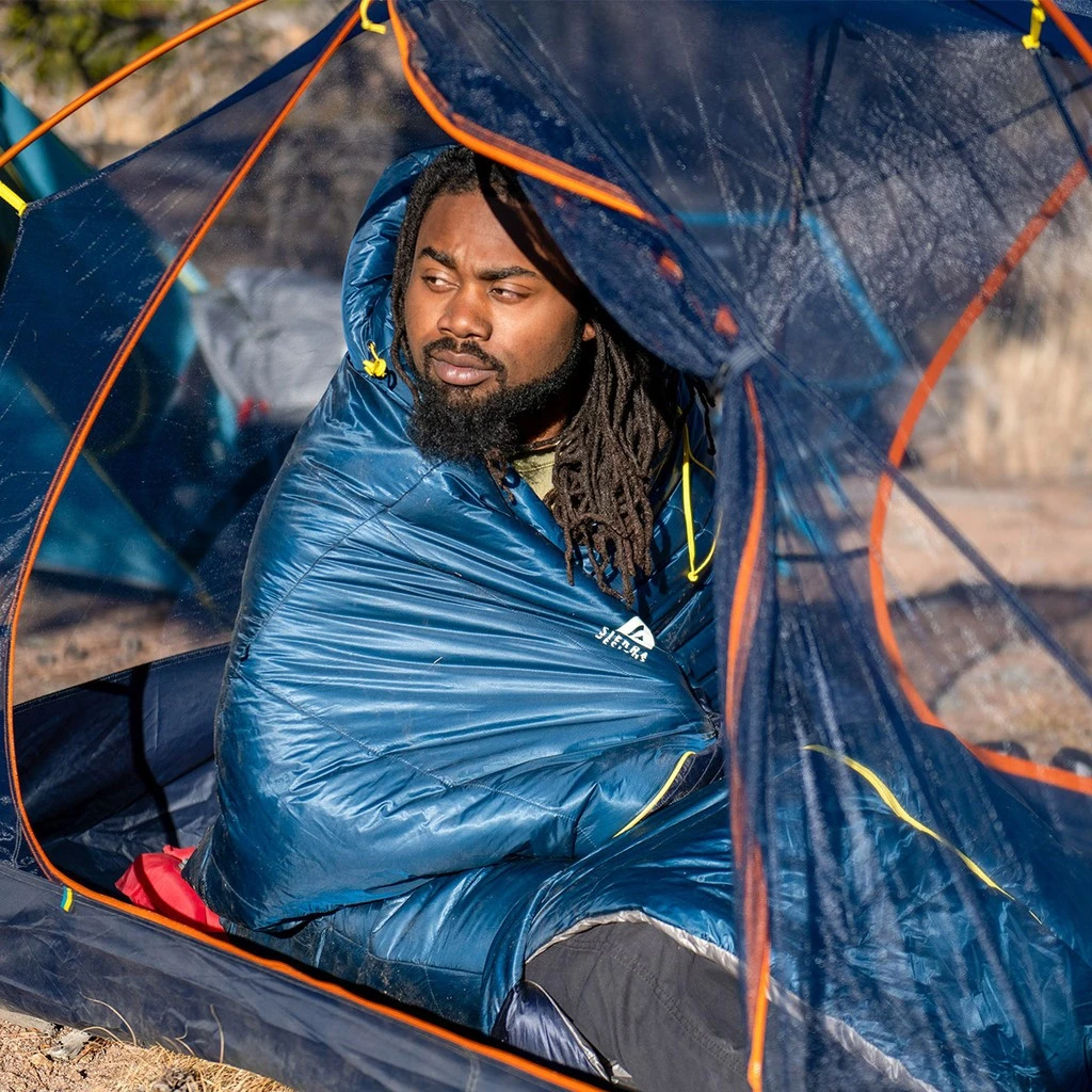 L’Elemental Quilt 35 de Sierra Designs est un hybride entre une couette et un sac de couchage, mieux que ça, il peut faire les deux ! En fonction de la météo, de votre humeur, de la température vous pouvez refermer le zip central et ainsi obtenir un sac de couchage de forme momie avec une capuche ajustable et un col.